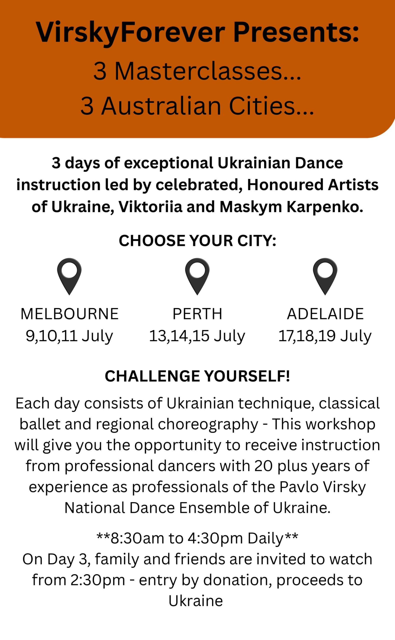 Cultural Events March 2, 2026 VIRSKY Forever Adelaide 2026 – Ukrainian Dance Masterclass Send Share Share